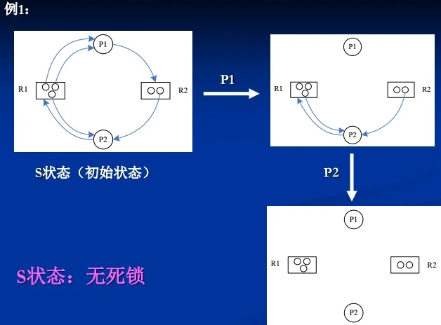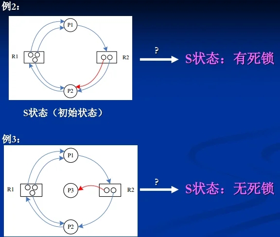 注: e.g.2: P1 申请 R2, R2 分配给 P2, 还剩下 0 个资源, 不满足, 无法释放 P1. P2 申请 R1, R1 分配给 P1, P2, 剩下 0 个资源, 不满足, 无法释放 P2.