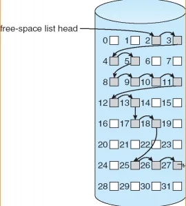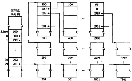 链栈的每个结点存储一组(例如100个)磁盘块号,其中最后一个磁盘块号指向下一组所在的磁盘块。