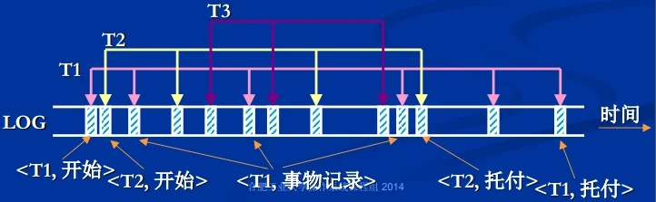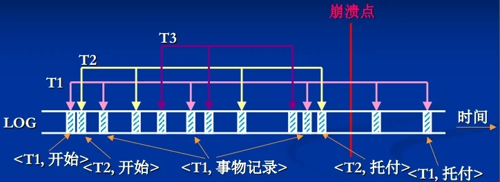 设置事务日志(LOG),按时间顺序存放事务记录,LOG存放在稳定存储器中;事务记录包括下列4类: