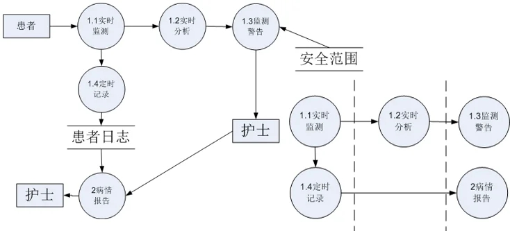 ,每个病人的 生理信号(脉搏、体温、血压、心电图等),定时记录 病人情况以形成 患者日志,当某个病人的生理信号超出医生规定的 安全范围 时,向值班护士发出 警告信息,此外,护士在需要时,还可以要求系统印出某个指定病人的 病情报告。