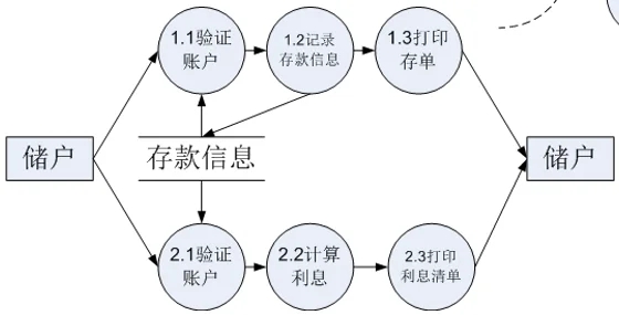 。储户 填写的 存款单或取款单 由 业务员 输入系统,如果是 存款,系统记录 存款人姓名、住址、存款类型、存款日期、利率 等信息,并印出存款单给储户;